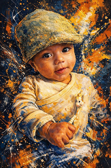 Le portrait est sublimé par une interprétation artistique contemporaine, où matière, lumière et abstraction transforment ce souvenir en pièce murale élégante et intemporelle.